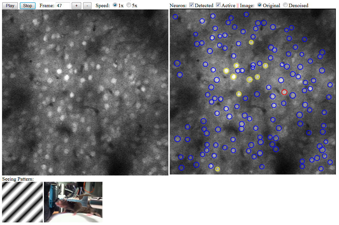 In the below figure, you can see the yellow circles are the detected neurons that are in the firing status. The left hand side shows the control of video playing of the original sequence, with the current frame number and the 1x and 5x playing speed. In the right hand side, the analyst can choose to see detected and/or active neurons on the background of the original video or the denoised/normalized video. In this figure, the mouse was seeing a moving diagonal pattern with the stripes angled at 45 degree and the direction of movement was 135 degree.