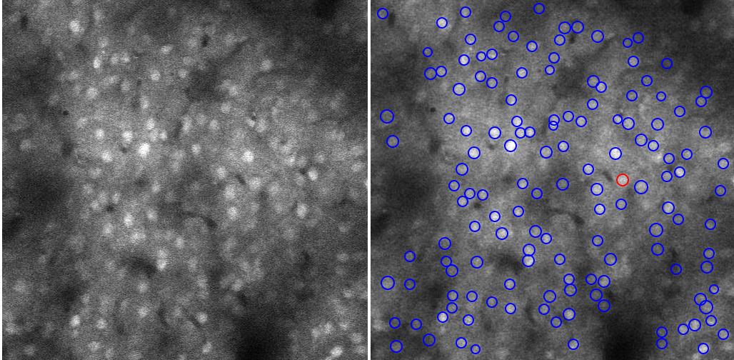 The following figure shows an example of calcium brain neuron image and the detected neurons. The blue circles are detected neurons (or, more precisely, the "Regions of Interest -- ROIs"). The red circle inidiates the signal analyis of the neuron that is being shown on the interface.