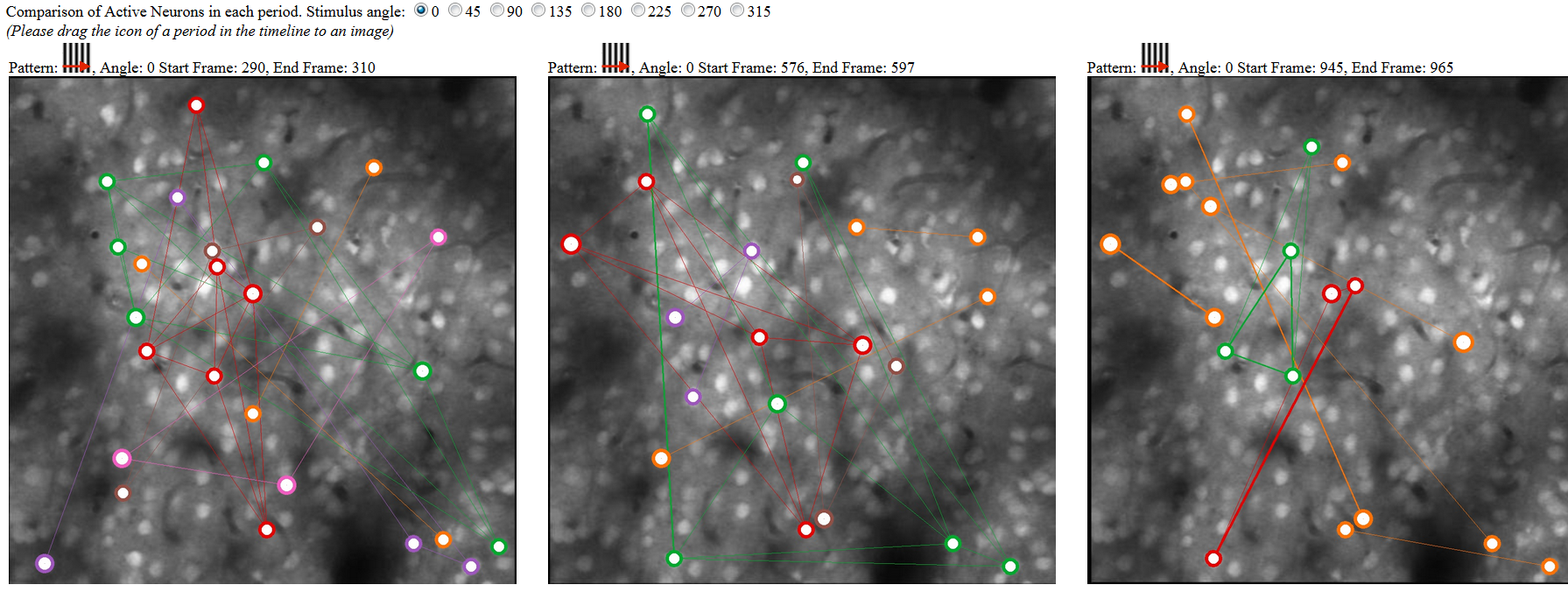 At the bottom of the tool includes three canvases to allow analyst to drag and drop any period to compare the detected neuron network of that region. It can help analyst to examine whether the neurons showed similar (or related) networks based on similar types of stimilus. The color of the neuron circles indiates a cluster (connected component) in that period. The linkage was created based on the firing at the same time.