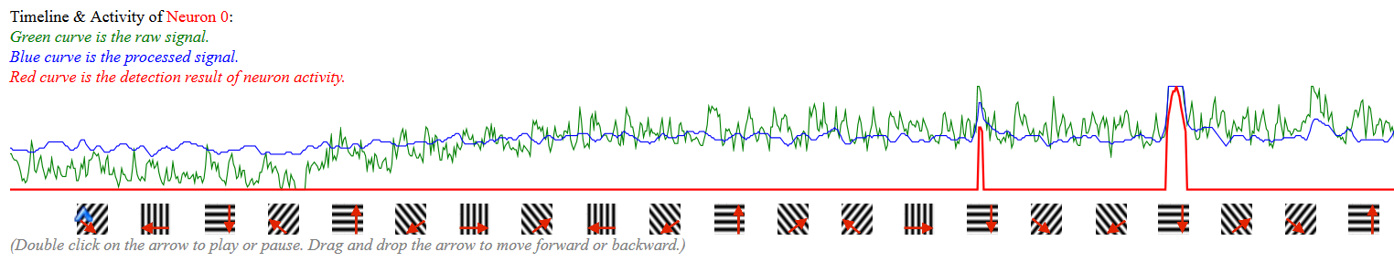When an analyst clicks on a neuron, she can see the raw signal, processd signal, and the detection result of that region of interest throughout the entire experiment that consists of alterate periods of mouse seeing different patterns and seeing nothing. This function can help analyst have a clear view on the neuron activity through different stimulus.